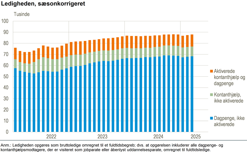 Hvor høj er ledigheden i Danmark, og hvordan har den udviklet sig de seneste år? Er der forskel i ledigheden, når det gælder mænd og kvinder, og hvor mange går ledige i lang tid? Den registerbaserede ledighedsstatistik (bruttoledigheden) omfatter samtlige jobparate dagpengemodtagere og jobparate kontanthjælpsmodtagere, m.v.