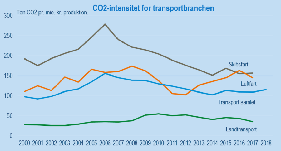 I årene fra 2006 til 2014 faldt CO2-intensiteten samlet for transportbranchen, hvilket især skyldes et fald på næsten 50 pct. inden for skibsfart fra 2006 til 2014.