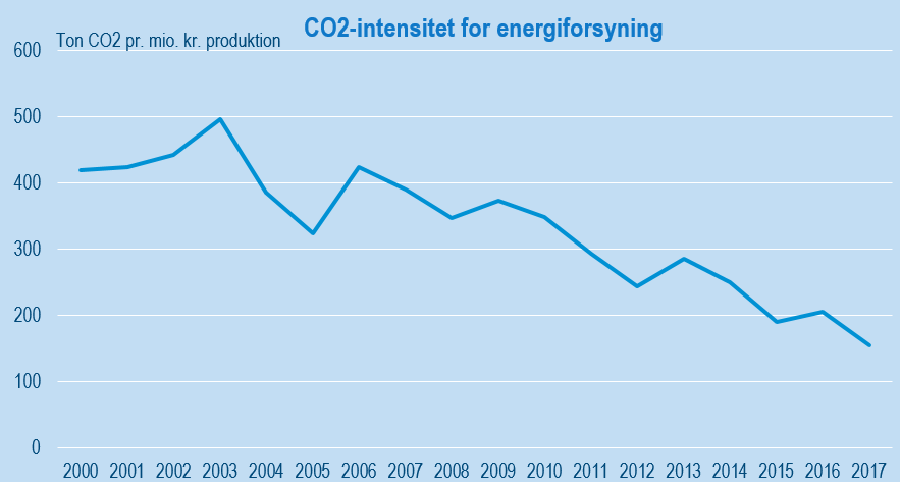 CO2-udledningerne fra energiforsyningsbranchen (kraftværker mv.) er faldet markant fra 29,5 mio. ton i 2003 til 7,1 mio. ton i 2018. Det skyldes i høj grad at produktionen af energi er blevet meget mindre CO2-intensiv. I 2003 blev der udledt 496 ton CO2 for hver mio. kr. produktion i energiforsyningen, det tal var i 2017 faldet til 154 ton.