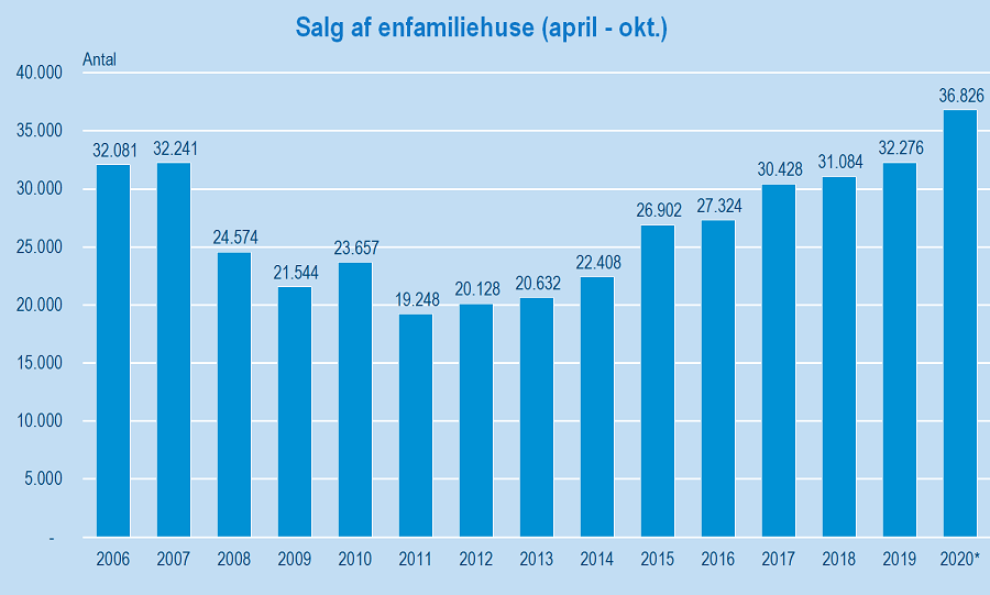 Samtidig er der i perioden april-oktober 2020 solgt næsten 37.000 enfamiliehuse, hvilket er det højeste antal nogensinde.