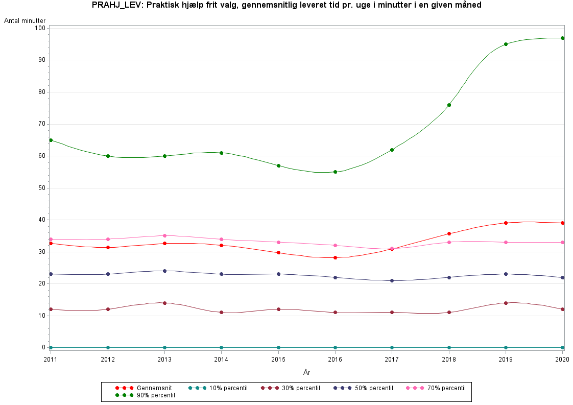 Leveret tid beregnes som et gennemsnitligt antal minutter pr. uge i en given måned. Hvis en borger fx modtager til 0,5 times praktisk hjælp hver anden uge, så er gennemsnitlige antal minutter pr. uge angivet til 15 minutter. Når der i datasættet står 15 minutter, betyder det således, at modtageren for den pågældende måned vil modtage 64,5 minutters hjælp (4,3 uger gange 15 minutter).