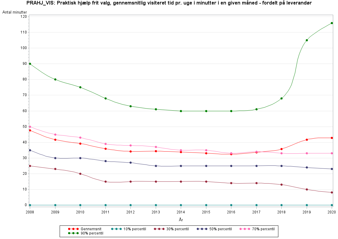 Praktisk hjælp frit valg, gennemsnitlig visiteret tid pr. uge i minutter i en given måned - fordelt på leverandør.