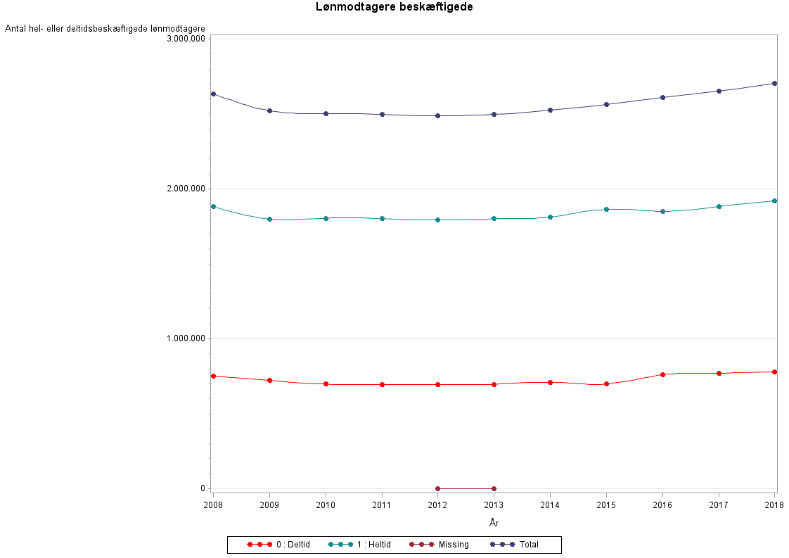 Graf og tabel er kørt for I_BEFOLKNINGEN_KODE=1 (i befolkningen på referencetidspunktet) og PRIMAER_STATUS_KODE=1 (kode for primær tilknytning til arbejdsmarkedet) og SOC_STATUS_KODE >=131 og SOC_STATUS_KODE <=136 (lønmodtagere).