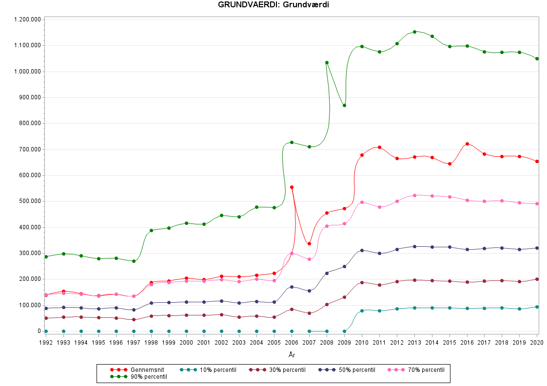 Grafen for GRUNDVAERDI viser kraftige udsving omkring 2006, hvor finanskrisen startede. Det er ikke blevet undersøgt, hvorfor mange ejendomme har en grundværdi på 0 før 2010.