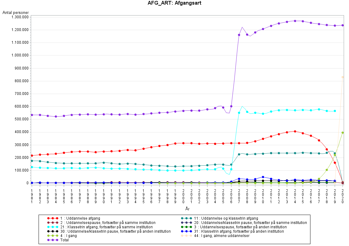 Værdien af 1. karakter af afgangsart fortæller, om afgangen fra en record er afgang fra selve uddannelsen eller en afgang fra en uddannelsesdel, som følge af en pause i uddannelsesforløbet eller et institutionsskift.