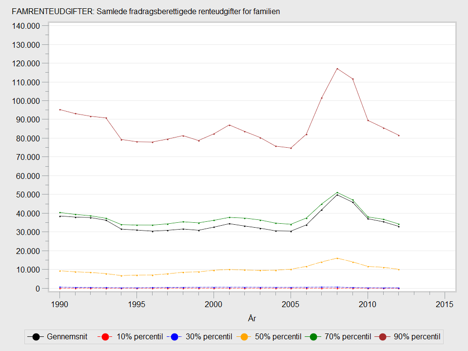 Renteudgifterne er fra 1990 til 2012 faldet med 14 pct. Dette skyldes især, at rentesatsen er faldet kraftigt i perioden.