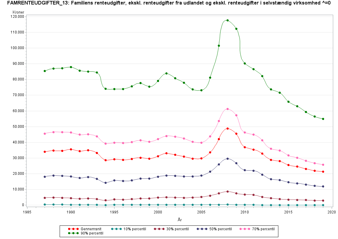Variablen omfatter renteudgifter af gæld i pengeinstitutter, pensionskasser, realkreditinstitut, kurstab ved omlægning af kontantlån, pantebreve og renter af studielån (medgår først, når renterne betales).