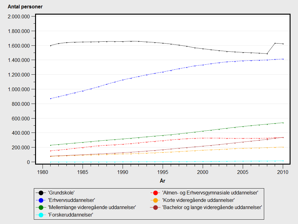 Til og med skoleåret 2005/06 er der kun blevet indsamlet uddannelsesoplysninger fra grundskolens 8., 9., og 10. klasse, hvilket betyder at aldersgruppen fra 0 til ca. 14 år vil have en uoplyst højeste fuldførte uddannelse. Fra og med skoleåret 2006/07 indsamles der oplysninger fra og med børnehaveklassen, hvilket i 2009 betyder en stigning i personer med en højst fuldført grundskoleuddannelse.