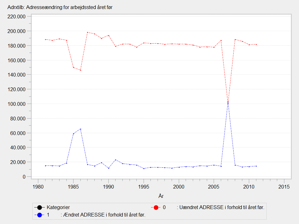 I denne variabel markeres det, om en adresseændring har fundet sted. Variablen indeholder ikke en adressekode, idet denne angives i variablen ADRESSE (se under emnegruppen arbejdssteder).I det følgende redegøres for, hvorledes en adresseændring registreres.