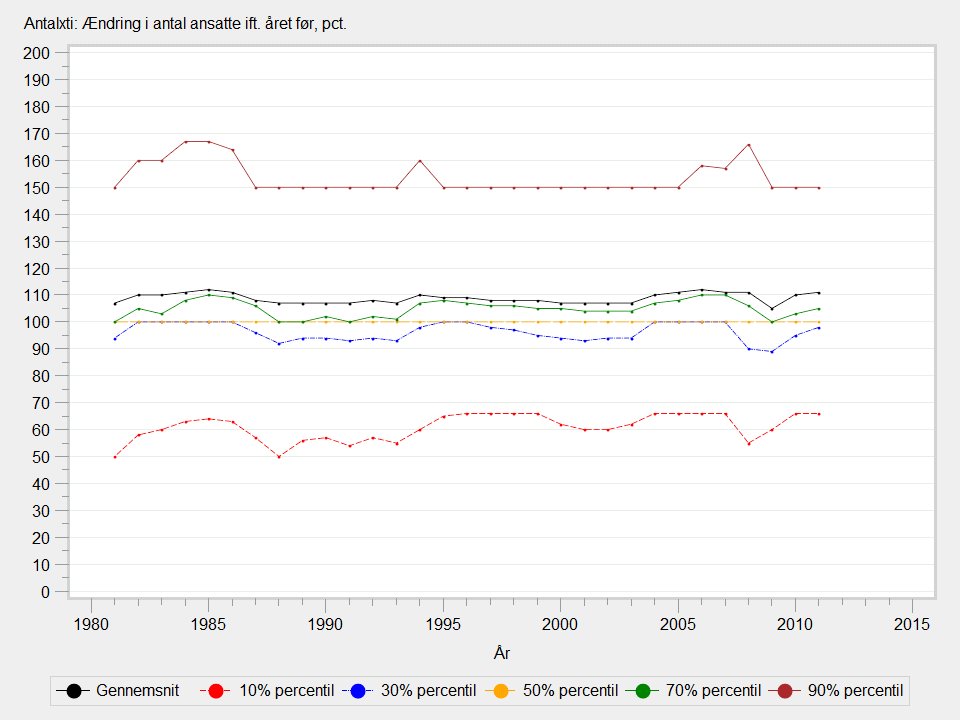 Bevarede arbejdssteder (IDTILB = B1, B2) tildeles værdien BLANK, hvis der kun findes bibeskæftigede året før. Nyoprettede arbejdssteder tildeles generelt værdien BLANK. Hvis procenttallet er større end 999 (svarende til en 10-dobling eller derover), sættes ANTALXTI = 999.