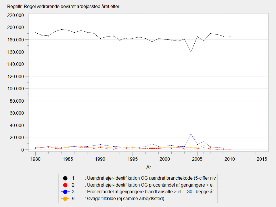 2: Uændret ejer-identifikation OG procentandelen af gengangere > eller = 30 i det ene eller begge år. For enkeltrelationer kræves kun, at arbejdsgivernummeret er uændret, mens det for flerrelationer kræves, at såvel arbejdsgivernummer som arbejdsstedskoden er uændrede.