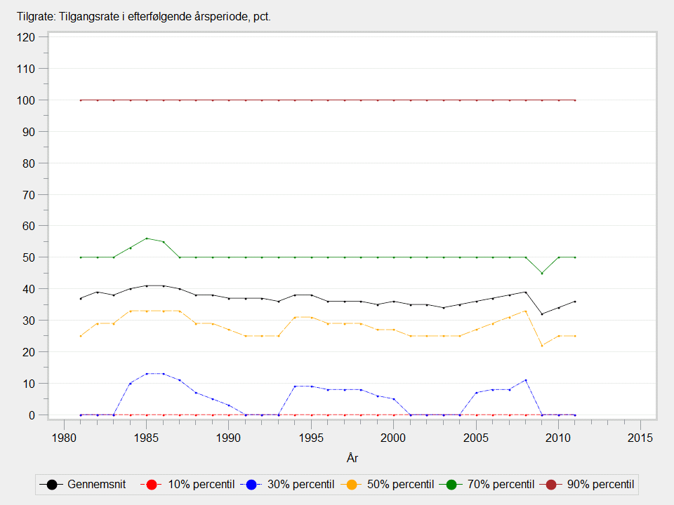 I 2007 er 50 pct.-percentilen lig 31. Det betyder, at 50 procent af arbejdsstederne har en tilgangsrate i forudgående årsperiode under 31 procent. De arbejdssteder, der ligger i 50-percentilen og derover har en tilgangsrate i forudgående årsperiode på 31 procent eller derover.