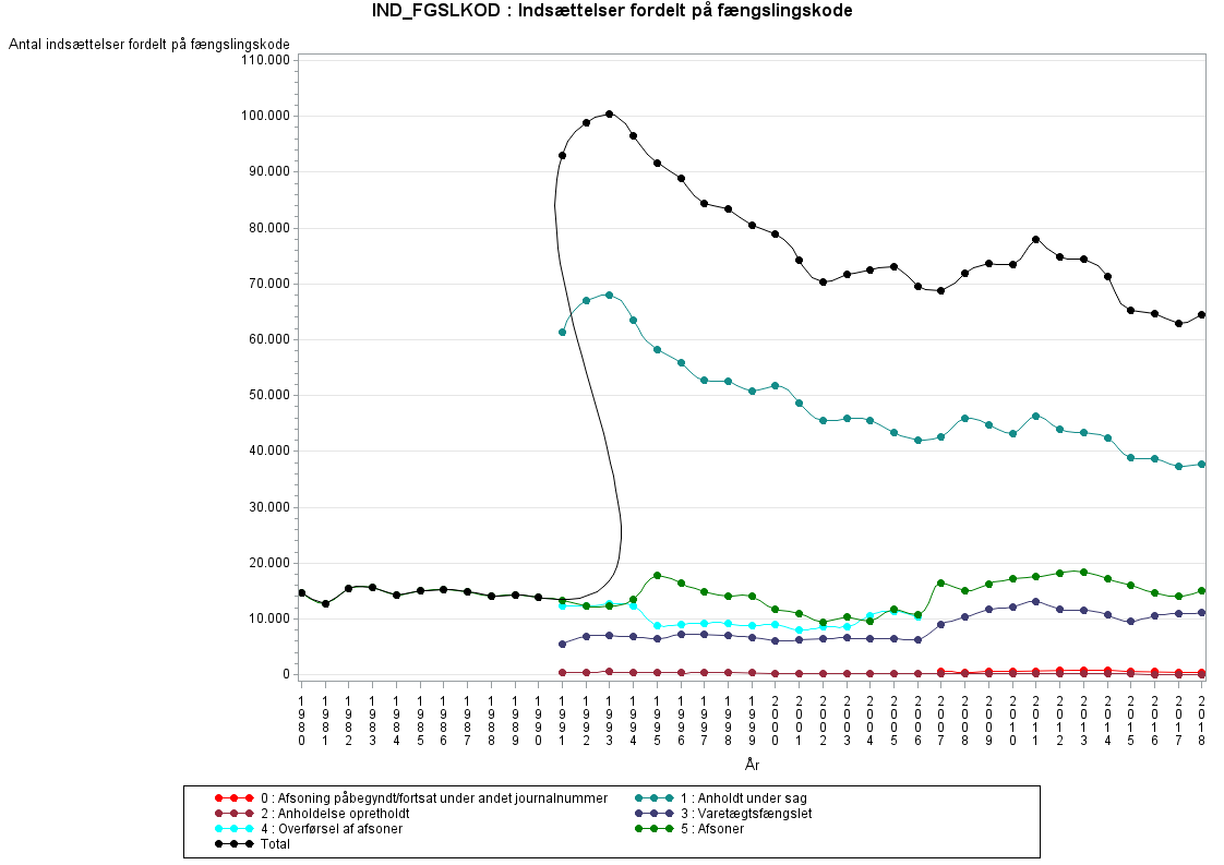 Fra 1991-2006 optræder IND_FGSLKOD = 1, 2, 3, 4 og 5. Det skyldes, at registret fra og med 1991 også omfatter anholdelser og varetægtsfængslinger samt overførsler mellem fængslingssteder, jf. indholdsbeskrivelsen af statistikområdet indsættelser.