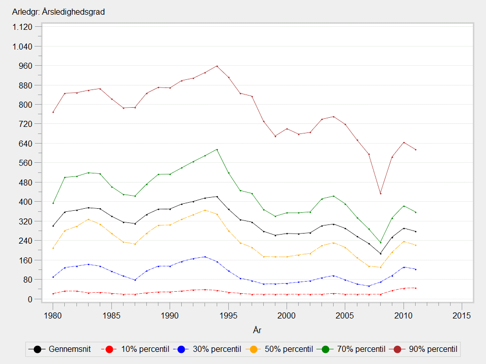 I 2006 er 50 pct.-percentilen lig 169. Det betyder, at 50 procent af personerne har en årsledighedsgrad under 169. De personer, der ligger i 50-percentilen og derover har en årsledighedsgrad på 169 eller derover.