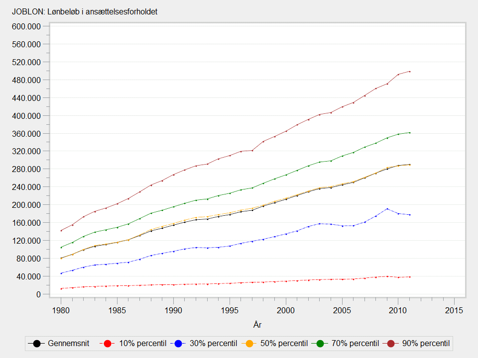 Udviklingen i lønbeløbet i ansættelsesforholdet i 2008 skyldes at datagrundlaget for lønmodtagerbeskæftigelsen ændres til eIndkomst fra og med IDA2008. For yderligere information om eIndkomst se emnegruppen Beskæftigelse og herunder statistikområdebeskrivelsen "Befolkningens tilknytning til arbejdsmarkedet (RAS)".