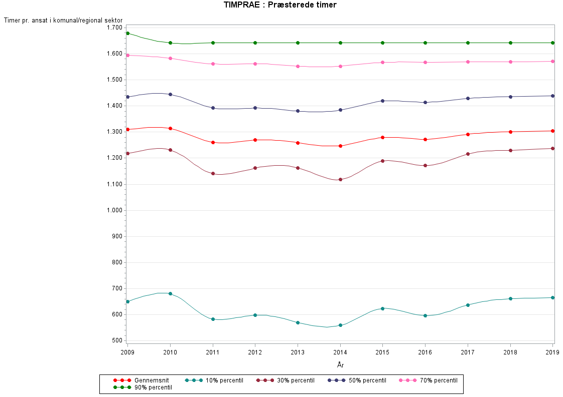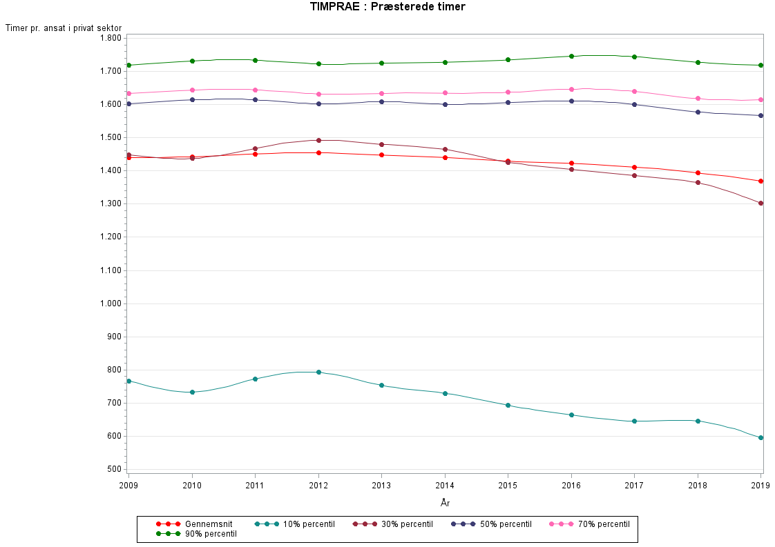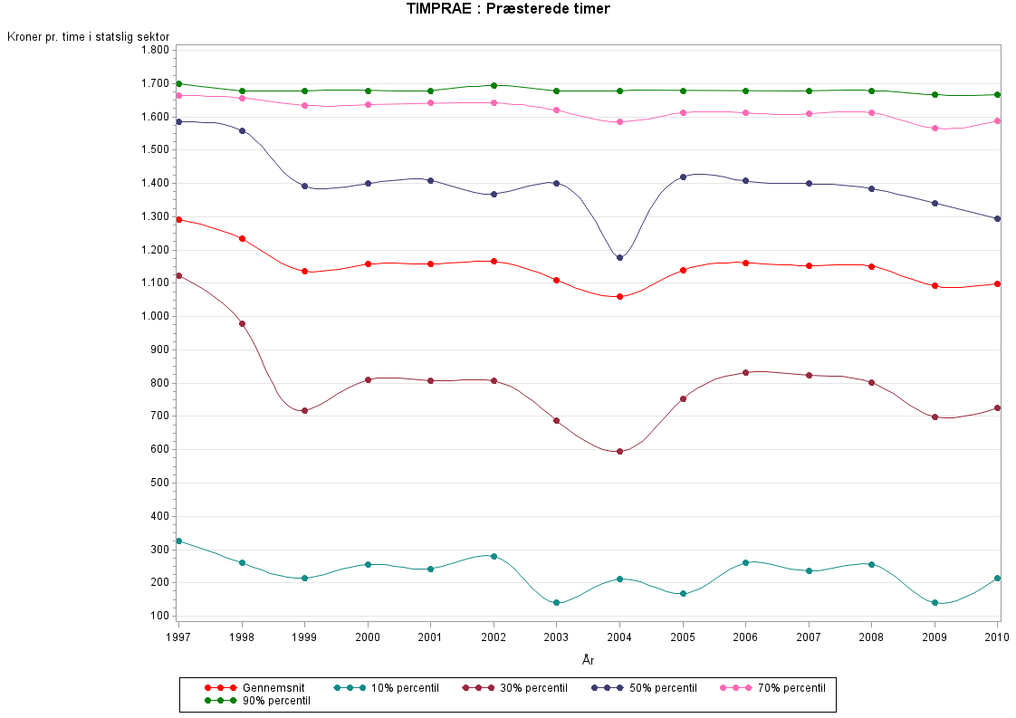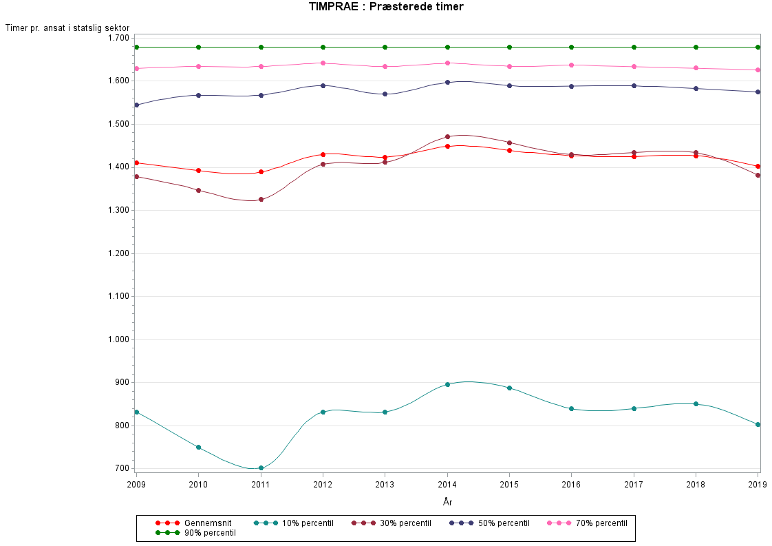 Med præsterede timer menes den tid lønmodtageren rent faktisk har været på arbejde. Fraværstimer i forbindelse med sygdom, ferie eller andet indgår dermed ikke. Ubetalte overabejdstimer indgår ikke i opgørelsen af præsterede timer, da de i sagens natur ikke er registreret i lønsystemerne.TIMPRAE defineres som TIMNORM+TIMOVER-TIMFRA-TIMSH-FERIETIMER. Se mere i beskrivelsen af de enkelte variable.