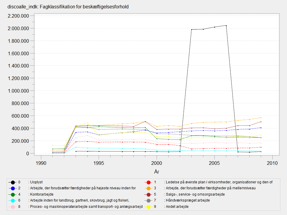 Det betyder, at opgørelser af DISCOALLE_INDK før år 2003 kan indeholde DISCO-kode for arbejde i tidligere år for fx pensionister. Opgørelser kan evt. afgrænses til populationen afgrænset ved: variablen BESKST eller BESKST02 antager værdi lavere end 6.