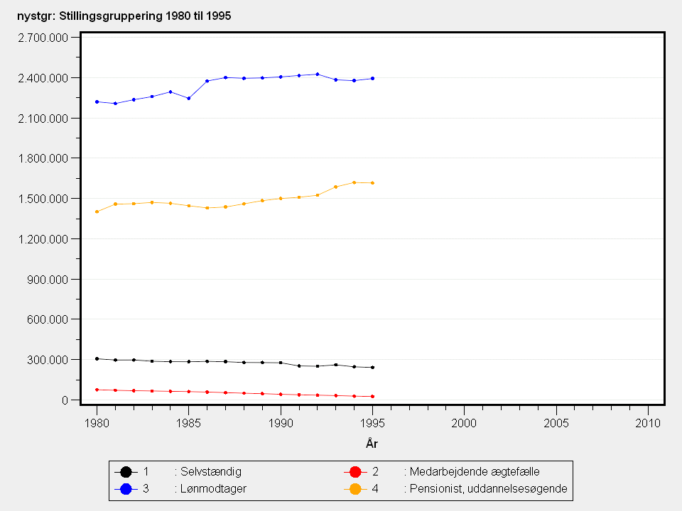 Der findes ikke nogen enkelt variabel, som går i stedet for NYSTGR efter 1995, men erhvervsaktive er i variablen DISCOALLE_INDK inddelt efter de færdigheder, der kræves for at udfylde det givne job og jobbets type. I NYSTGR er de erhvervsaktive inddelt efter stilling.