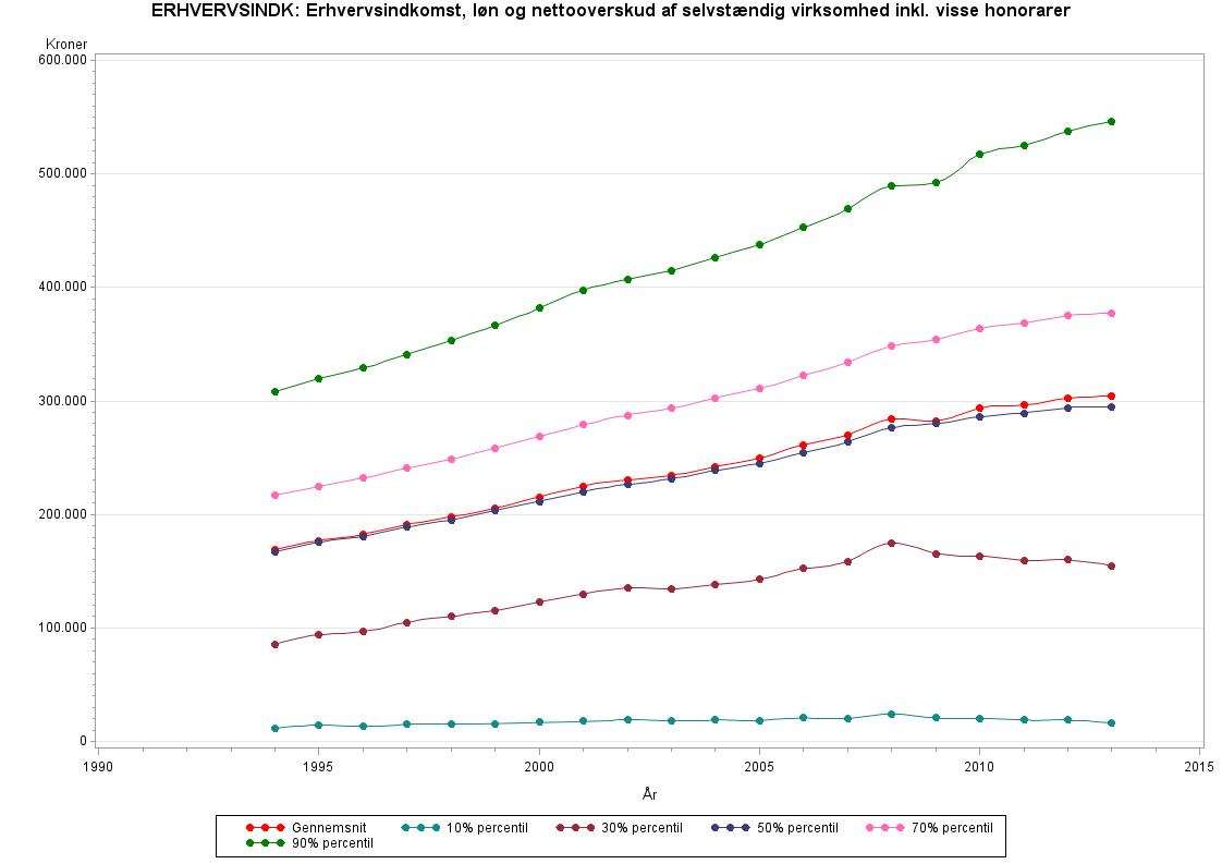 Erhvervsindkomsten er før kapitalindtægter og udgifter (herunder renter) i selvstændiges virksomhed, og ekskl bidrag til arbejdsgiveradministrerede pensionsordninger.
