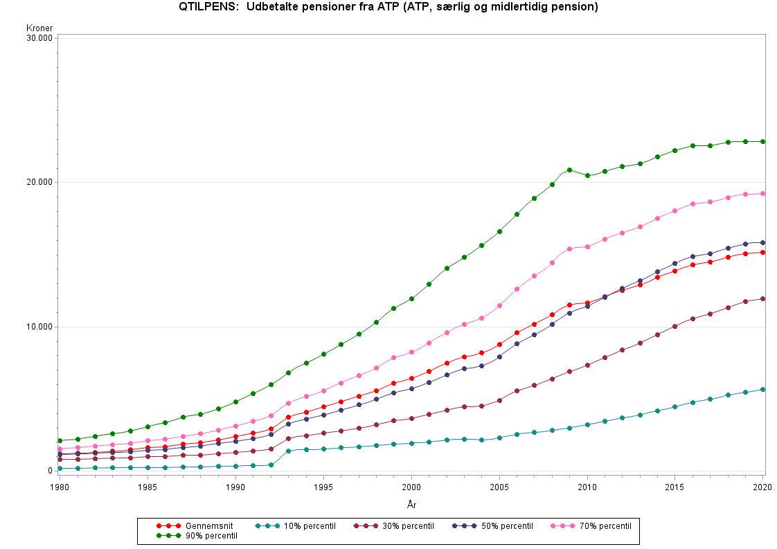 Fra 1. juli 1992 overgår efterlevendepension (ægtefæller) fra at være en ydelse der udbetales løbende til at være en engangsydelse. Den registreres ikke som en indkomst og indgår derfor ikke i QTILPENS. I stedet registreres den som en engangsudbetaling i registeret INHP med variabelnavn ATP_ENGANG. Det giver et stort fald i antal modtagere fra 1992 til 1993. Se også lov om ændring af lov om Arbejdsmarkedets Tillægspension m.v. (lov nr. 372, 1992).