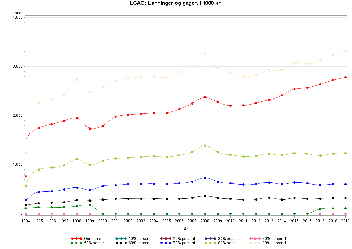 I posten "lønninger og gager" medregnes de samlede lønninger, herunder løn i produktionen, samt gager og vederlag til arbejdere, funktionærer, direktion og bestyrelse, inkl. ferieløn og -godtgørelse, overtidsbetalinger, løntillæg i form af gratis ydelser eller ydelser til nedsat pris, løn under sygdom og graviditet og diverse bonusordninger.Værdi er angivet i 1.000 kr.