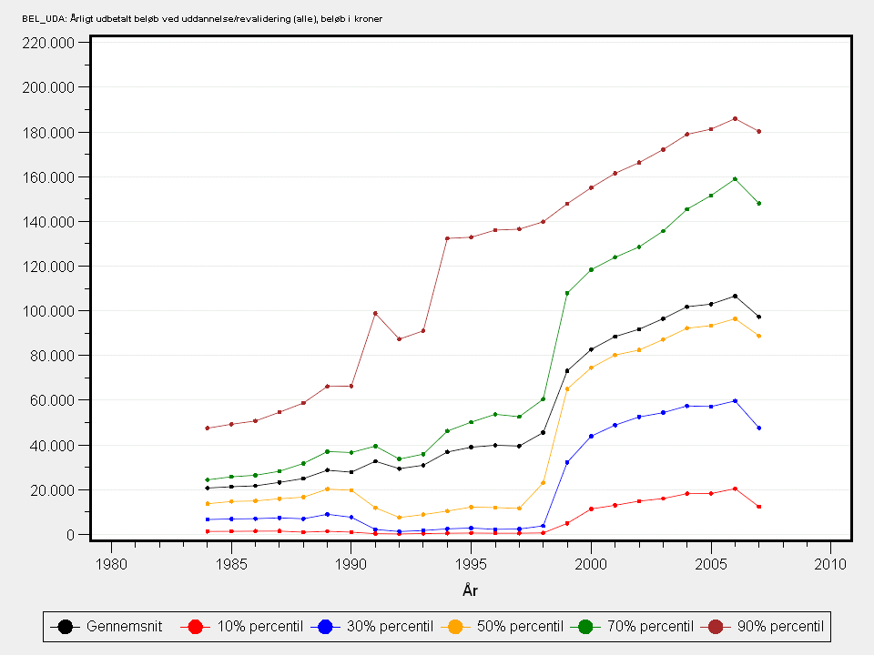 Årligt udbetalt beløb ved uddannelse/revalidering (alle). Beløb i hele kroner.
