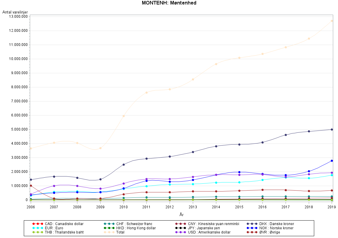 I tabel og figur er vist de ti mest anvendte valutaer i de danske toldangivelser